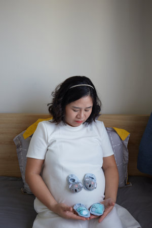 Photo of Happy Asian pregnant woman sitting in bed and touching her belly at home . With Small shoes for the unborn baby in the belly