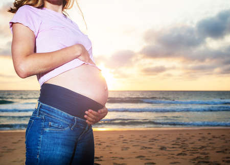 Close photo of a pregnant woman during vacations on the sand beach touch belly over sunset