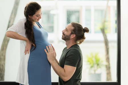 Handsome beard man take care his pregnant wife. Happy family concept.