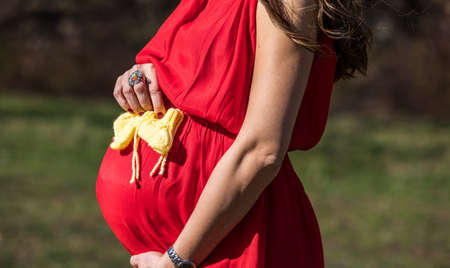 Baby shoes on the belly of a pregnant woman. It is a boy. Mom holding the belly.