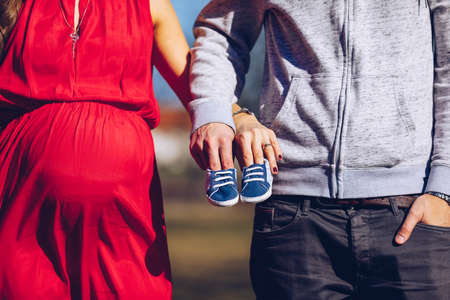 Young couple waiting for baby. Expecting parents with little baby boy shoes. Concept of Parents-To-Be. Shoes and sneakers of parents and expected baby. Mom, dad and the future baby Shoes.