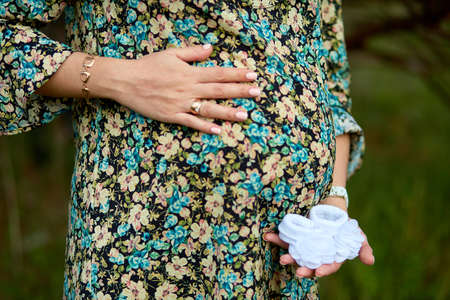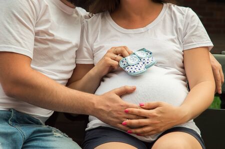 Close up. Waiting baby. A pregnant woman and the future father carefully hug the pregnant belly. On the stomach are blue booties.