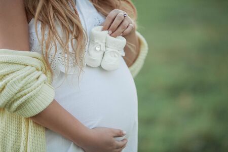 Pregnant woman with clothing for newborn baby close up. White woolen little baby slippers, socks in future mom hands..Symbol of happy pregnancy.