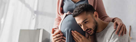 young man gently hugging belly of pregnant woman in kitchen, banner