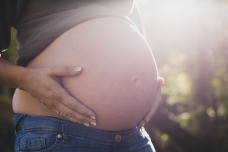 Unrecognizable pregnant woman touching belly, waiting for a miracle, Pregnant tummy close up, outdoor in spring or summer park