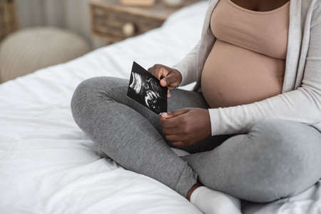 Black Pregnant Woman Looking At Ultrasound Image Of Her Baby While Sitting On Bed At Home, African American Expectant Mother Enjoying Healthy Pregnancy And Maternity, Cropped Image With Free Space