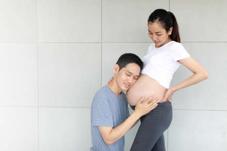 Happy Asian man proud and listening his smiling beautiful pregnant wife tummy and happiness. Family, Pregnancy, Dad and Mom and Couple concept.