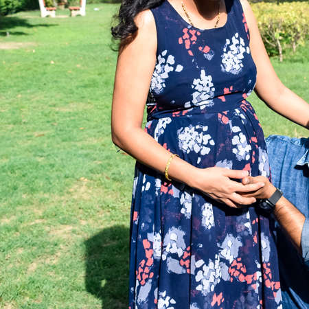 Indian couple posing for maternity baby shoot. The couple is posing in a lawn with green grass and the woman is falunting her baby bump in Lodhi Garden in New Delhi, India