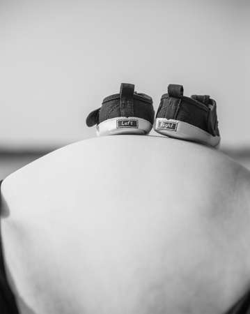Photo of a pregnant woman's belly and tiny shoes on top of it.