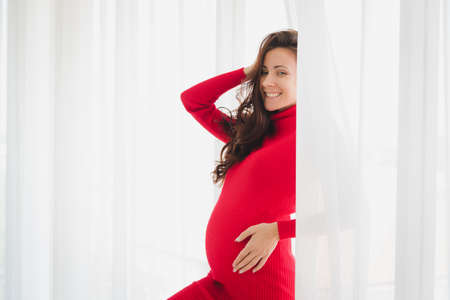 Portrait of pregnant woman in red sweater dress holding her belly with smile and happiness in modern bedroom.