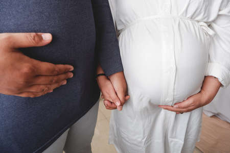 Pregnant belly and a beer belly against each other together close up, holding bellies by both hands side view, couple goals concept.