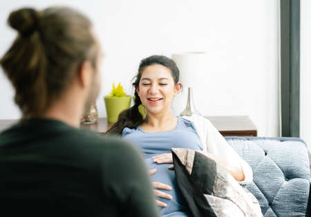 Pregnant Asian lesbian woman and her partner are happy to spend time together at home.