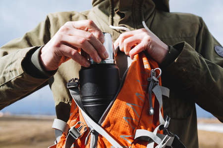 Vacuum metal flask to get your hand out of the backpack, collect equipment on a hike, hands hold tourist equipment, flask for hot drinks, dishes. high quality photo
