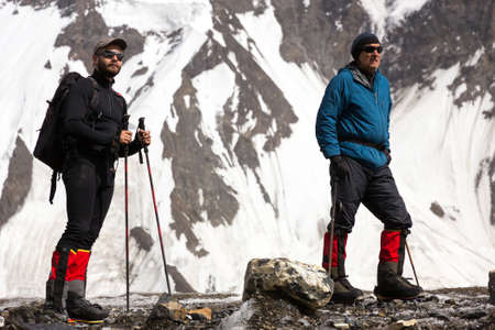 Caucasus / Russia - 02/06/2008 Group of climbers, acclimatization program in the mountains before climbing Mount Elbrus. Tourists take pictures on the background of high snowy mountain peaks.