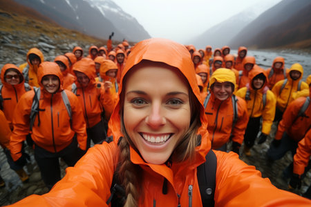 Amidst foggy mountains, a kayaker in an orange jacket leads a diverse group, ready for adventure. The atmosphere is thrilling, emphasizing teamwork and exploration in nature.