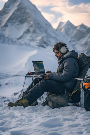 A man programmer coding on a laptop computer high in the mountain snowy hill. Remote work on mountain top. Sunny day.
