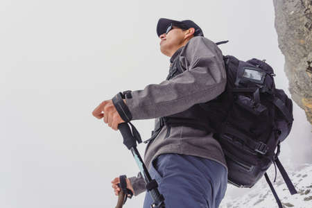 A guy with a beard and wearing sunglasses in a membrane jacket, hat, with a backpack and sticks for Nordic walking, a traveler standing and looking at the mountains