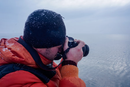 A traveler takes photographs of nature in winter