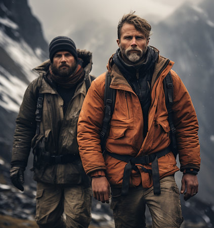 An AI generated illustration of Two adventurers are making their way across a rugged mountain landscape, walking along a glacial stream