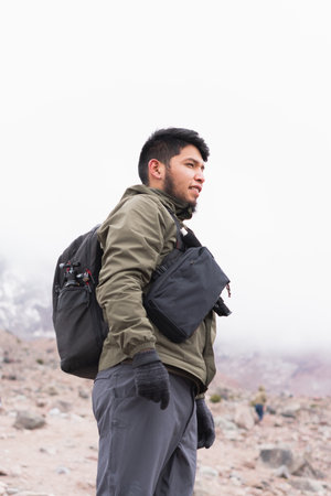 The guy takes pictures of volcanoes in Kamchatka peninsula in Russia