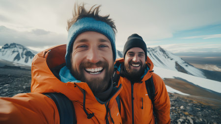 Hiker taking a selfie with his friend on the top of the mountain
