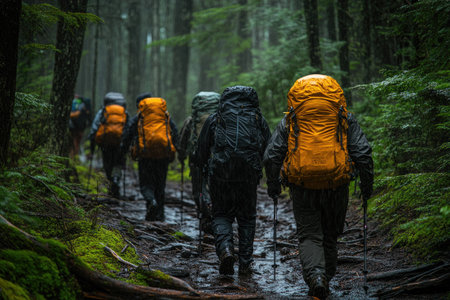 Group of hikers is trekking through a dense, verdant forest, their backpacks laden with gear for their outdoor adventure
