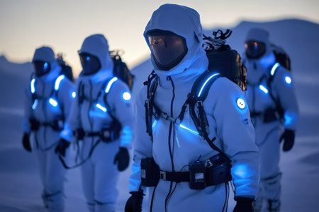 A team of adventurers in high-tech gear navigates a snowy landscape at dusk, prepared for exploration.