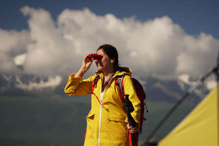 Young happy woman with backpack standing on a rock and looking through binocular to a valley below. On the cliff is a yellow tent.