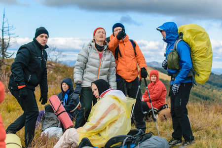 Carpathians, Ukraine- September 29, 2018: A group of people hiking on a halt during a tourist hike.