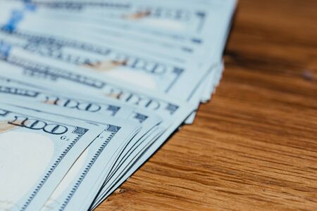 Selective focus on detail of USD banknotes. Counting or giving United States Dollars banknotes. World money concept, inflation and economy concept