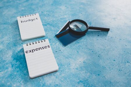 managing money and finance concept, budget and expenses notepads side by side on blue desk with magnifying glass and credit cards