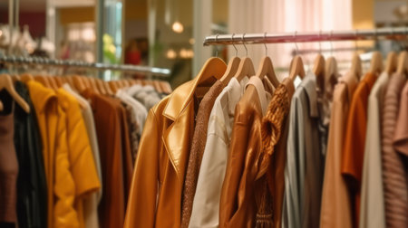 Boutique clothing rack featuring a variety of fashionable and stylish outerwear in warm tones. concept of fashion retail, style selection, clothing display.