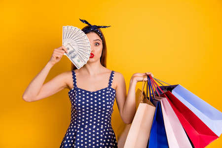 Portrait of cute trendy stylish person student hold hand banknote hide face lips pouted plump isolated over yellow background