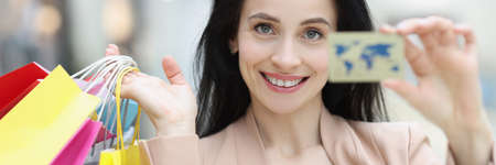 Portrait of young smiling woman holding credit bank card and shopping bags in hand