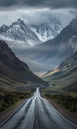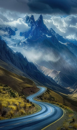 Winding road leading towards snowy peaks with dramatic clouds. Generate AI