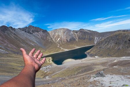 Hand showing a lake an a mountains on the top of Nevado de Toluca, Mexico