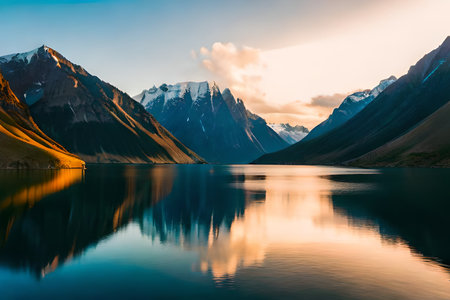 Majestic snow capped mountain peaks towering above a pristine glacial lake with the peaks perfectly reflected in the calm mirror like waters This breathtaking
