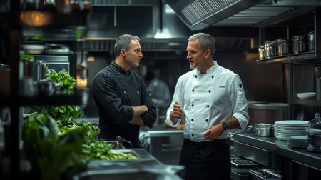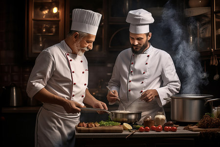Chef and cook cooking together indoors in restaurant kitchen.