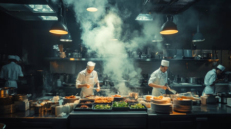 Professional chefs team collaborating in a busy commercial kitchen, preparing food by chopping and carefully creating new gourmet meal recipes with attention to detail.