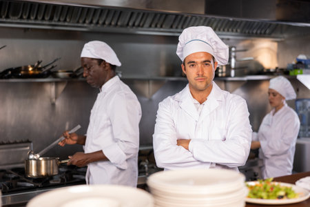 Focused man chef posing in restaurant kitchen
