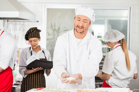 Male Chef Sprinkling Flour On Ravioli Pasta In Kitchen