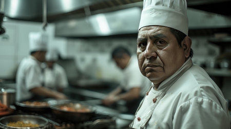 experienced cook with a surprised face from a useless team posing in a modern kitchen with his team in the background