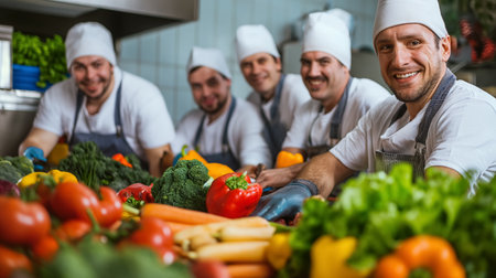 Portrait of diverse team posing in professional restaurant kitchen, getting ready to cook gourmet meal. Chefs in uniform doing dish preparations with food ingredients for gastronomy recipe.