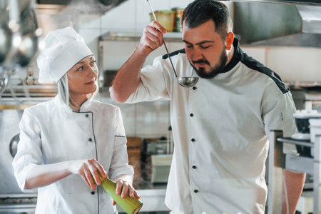 Young couple of chefs preparing food in the kitchen at the restaurant.