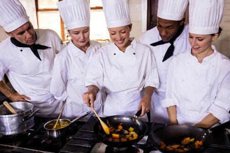 Male and female chefs preparing food in kitchen at hotel