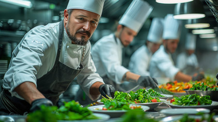 Chef preparing vegetable salad in restaurant kitchen. Professional chef decorating food.
