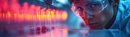 Researcher analyzing cell cultures in a sterile, futuristic biotech lab environment