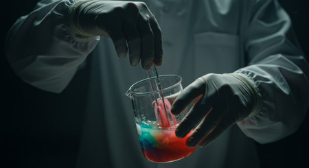 Close-up of a scientist in a lab coat and black gloves stirring a vibrant red liquid in a glass beaker with a stirring rod during a laboratory