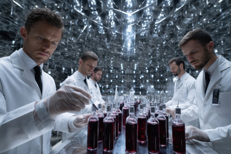 Six scientists in lab coats carefully analyze red vials in a reflective, high-tech laboratory environment.