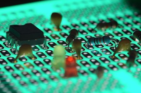 Closeup shot image of electronic circuit board. Shallow depth of field and selective focus. noise and grain due low light